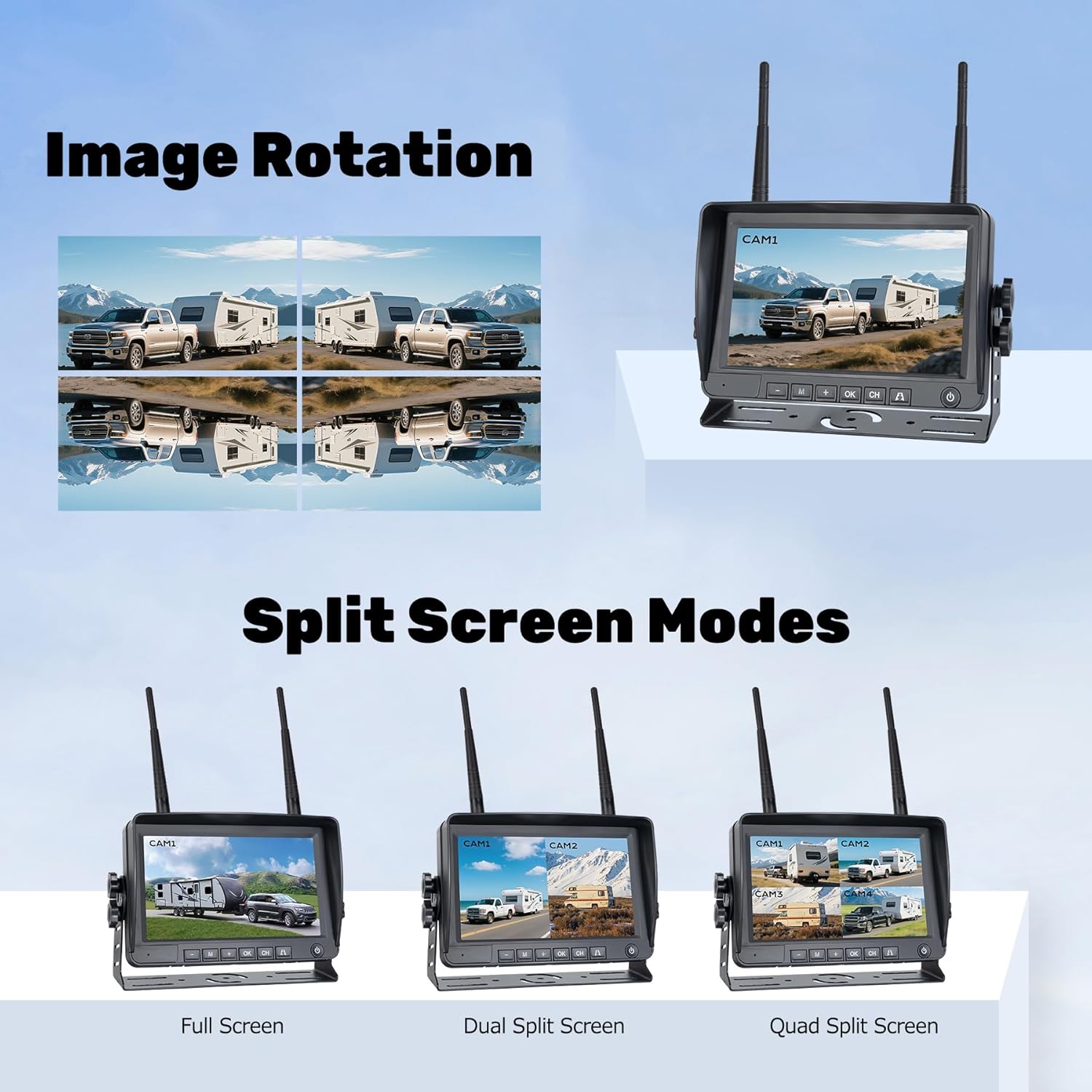 - 【Lag-Free 2.4GHz Wireless Connection】 Experience uninterrupted real-time monitoring through our enhanced 2.4GHz dual-antenna system, ensuring crystal-clear video transmission with zero latency. The extended 330-foot open-range coverage performs reliably even at highway speeds (102 mph), making it ideal for various applications: from passenger cars and SUVs to commercial vehicles like trucks, RVs, trailers, and marine equipment.