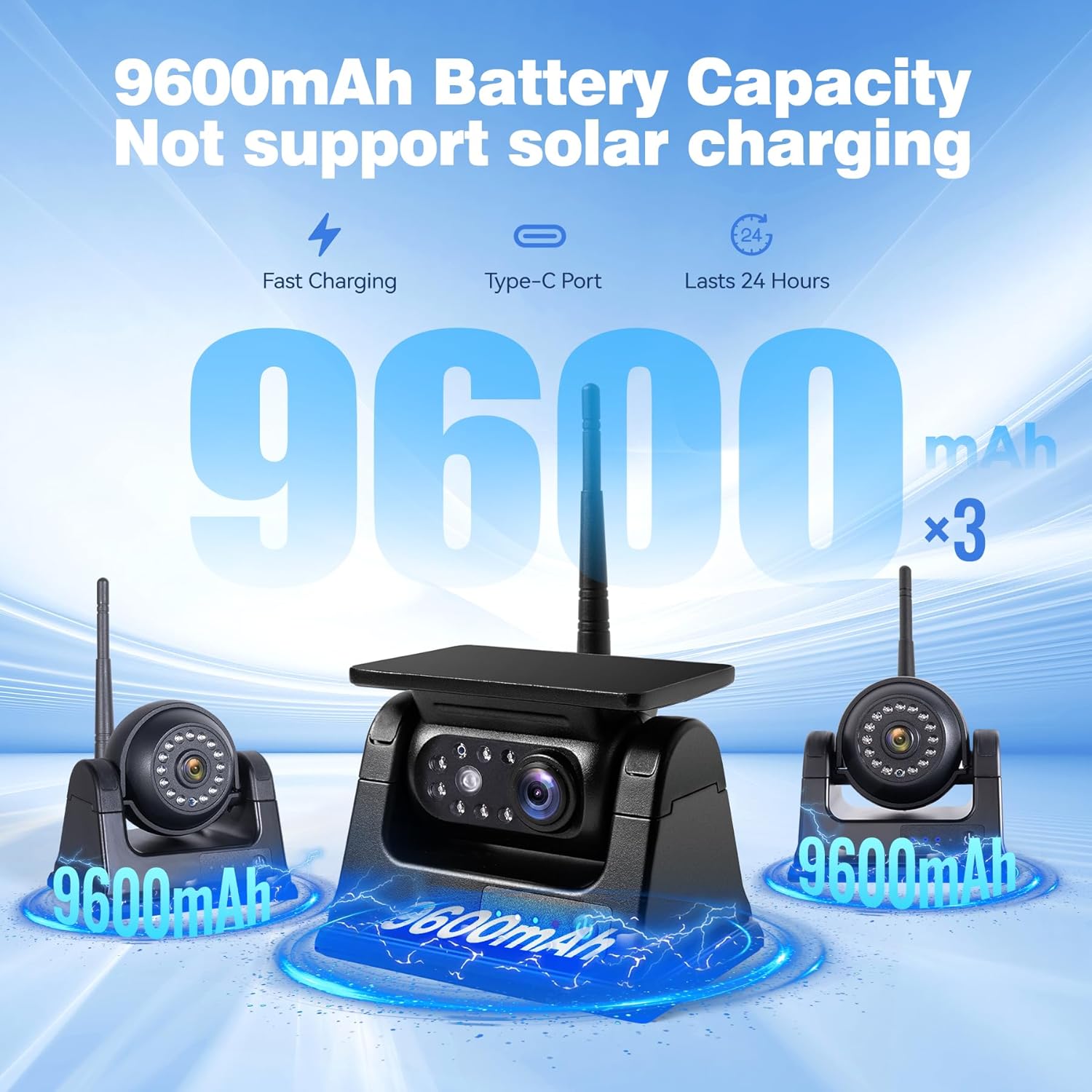 - 【3-Camera Safety Kit for Complete Visibility】 Get crystal-clear views from every angle with our wireless magnetic camera set (1 rear + 2 side cameras). The long-lasting 9600mAh batteries keep you protected all day, while the included 3 wall chargers (with durable Type-C cables) make powering up a breeze. Simply snap the super-strong magnets onto your vehicle - no tools or wiring needed! Perfect for trucks, vans, and RVs, with easy transfer between vehicles in seconds.