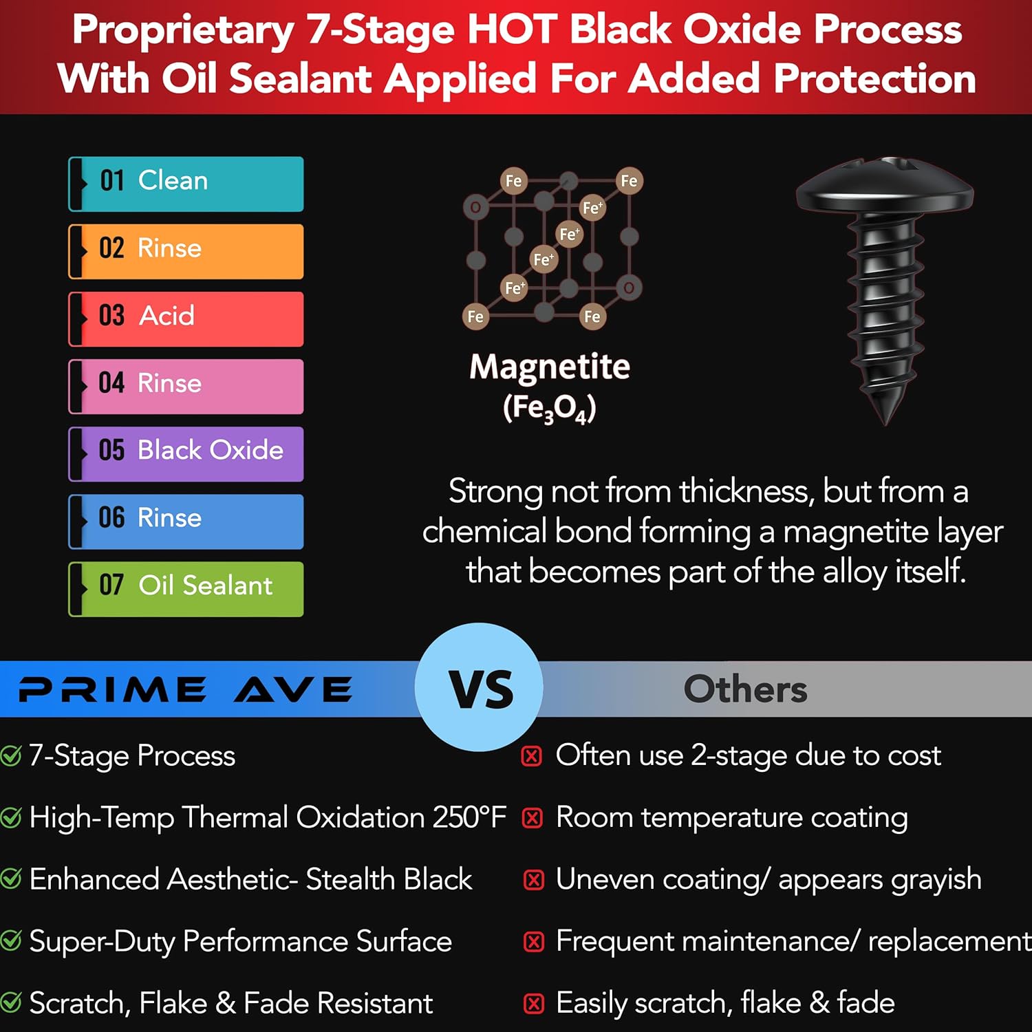 - Stainless Steel with HOT Black Oxide Coating: Made from premium stainless steel, each screw undergoes a proprietary 7-stage HOT black oxide treatment at 250°F. The process penetrates the surface to strengthen the alloy and deliver a sleek, high-performance black finish. A final oil sealant boosts corrosion resistance, reduces friction, and prevents galling under load. Our license plate fasteners are engineered to withstand the harshest weather — from driving rain and snow to corrosive salty roads. Built for unmatched durability, our screw for license plate deliver superior rust resistance while keeping your front or rear plates firmly secured, mile after mile.