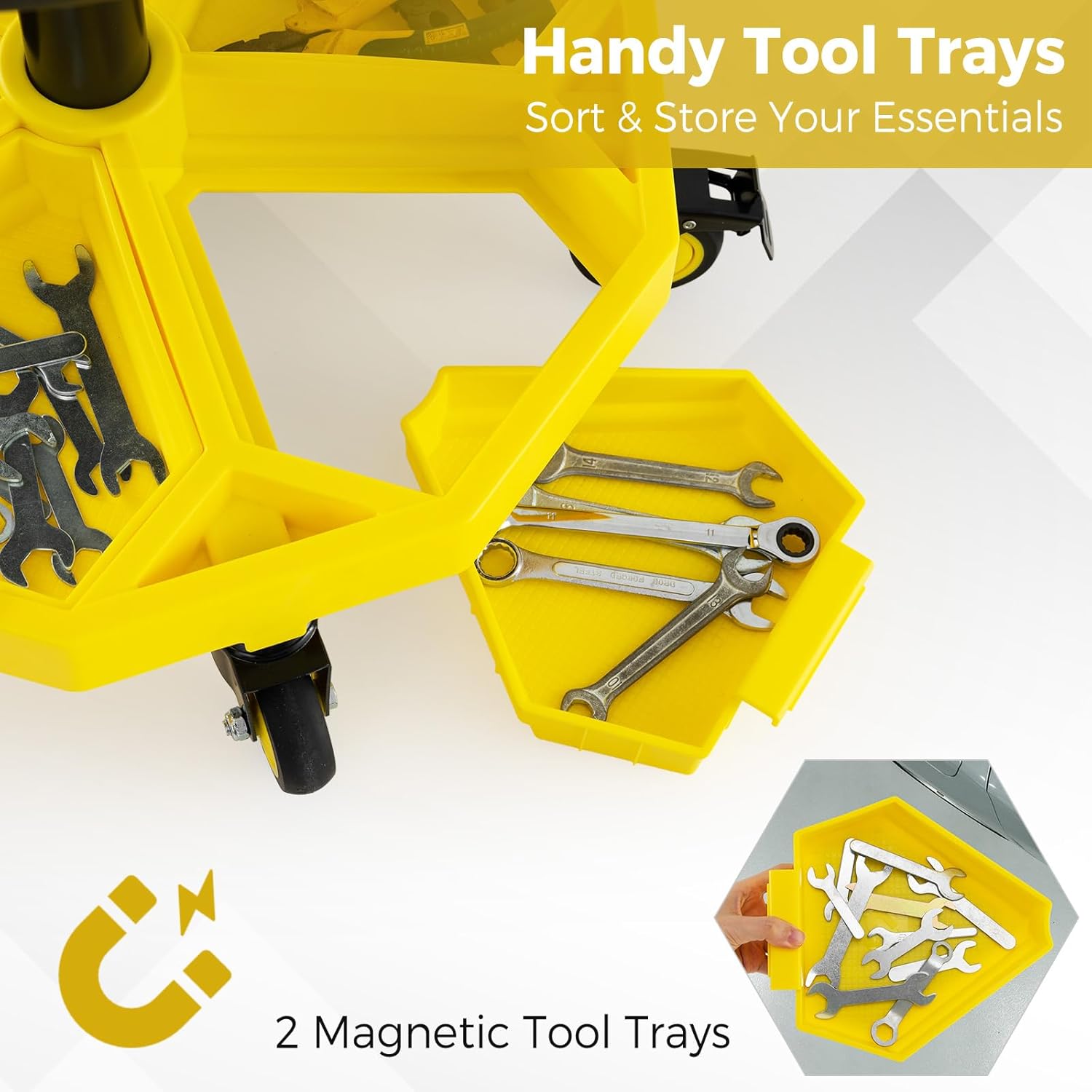 - γ Handy Tool Traysγ The garage stool features 5 tool trays located at the bottom, including 2 with magnetic surfaces to securely hold metallic parts and tools. The practical design keeps essentials within reach, streamlining your work flow.