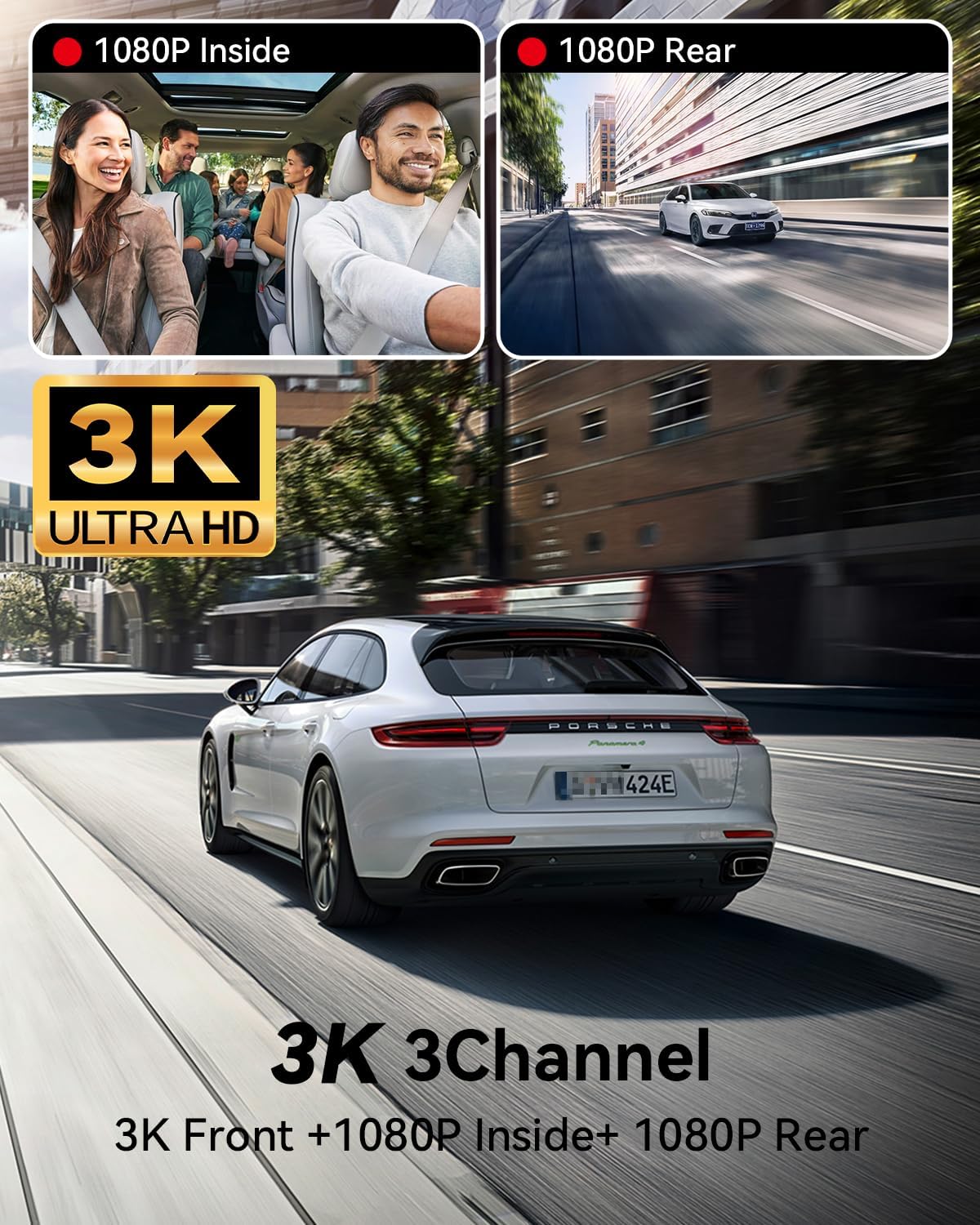 - ă3-Channel Dash Cam with 3K+1080P+1080PăThis 3 channel dash cam features an industry-leading SONY IMX sensor and processor, delivering smooth, high-definition video. With simultaneous 3-channel recording, it offers 3K (2880x1620) front, 1080P (1920x1080) inside, and 1080P (1920x1080) rear resolution for comprehensive protection. The 170° wide-angle front, 150° inside, and 170° rear cameras eliminate blind spots, ensuring full coverage. Perfect dash cam front and rear inside 24/7 recording.