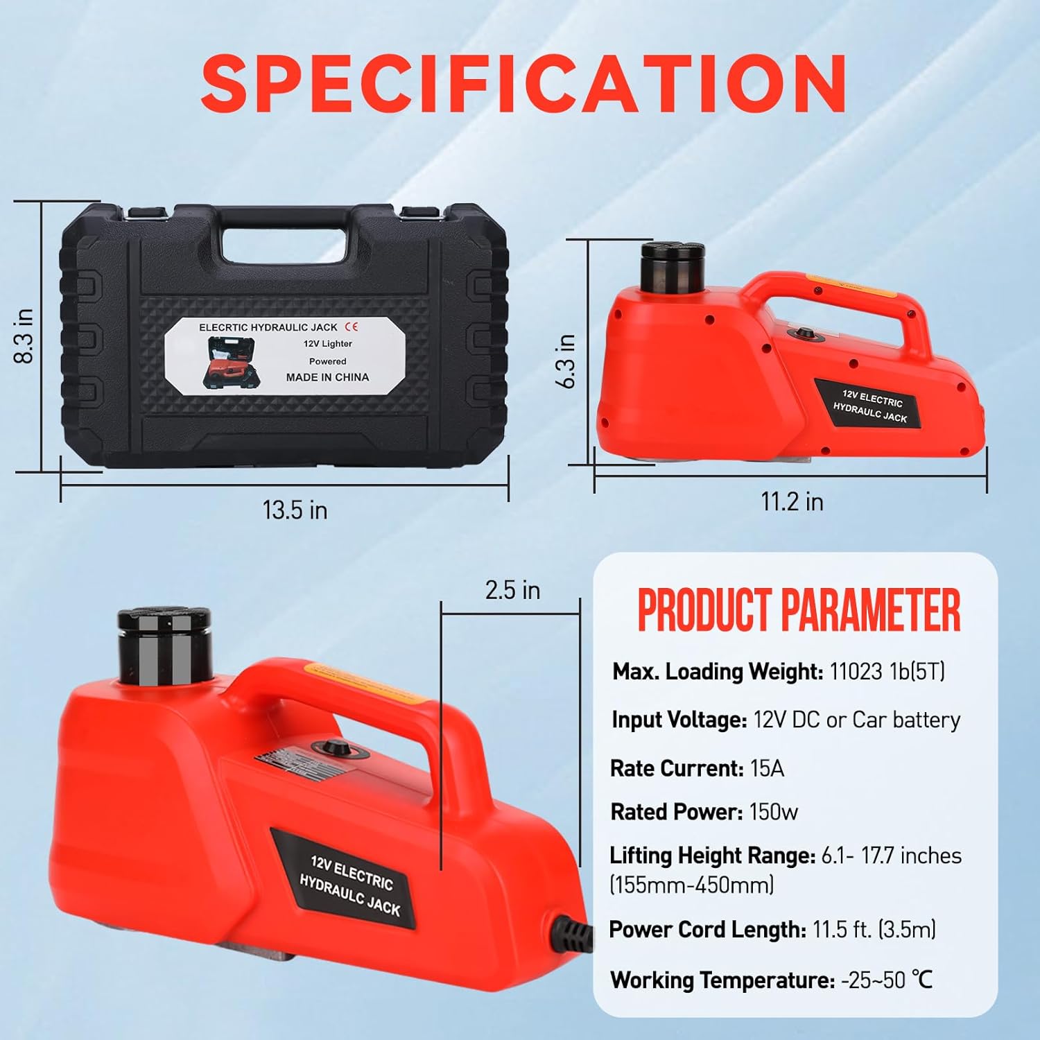- Powerful Electric Car Jack: This 5-ton (11023 lbs) hydraulic jack features a built-in motor and lifts most vehicles from 6.1" to 17.7" in 2 minutes. Enables fast, efficient tire changes anywhere β roadside, parking lot, or garag