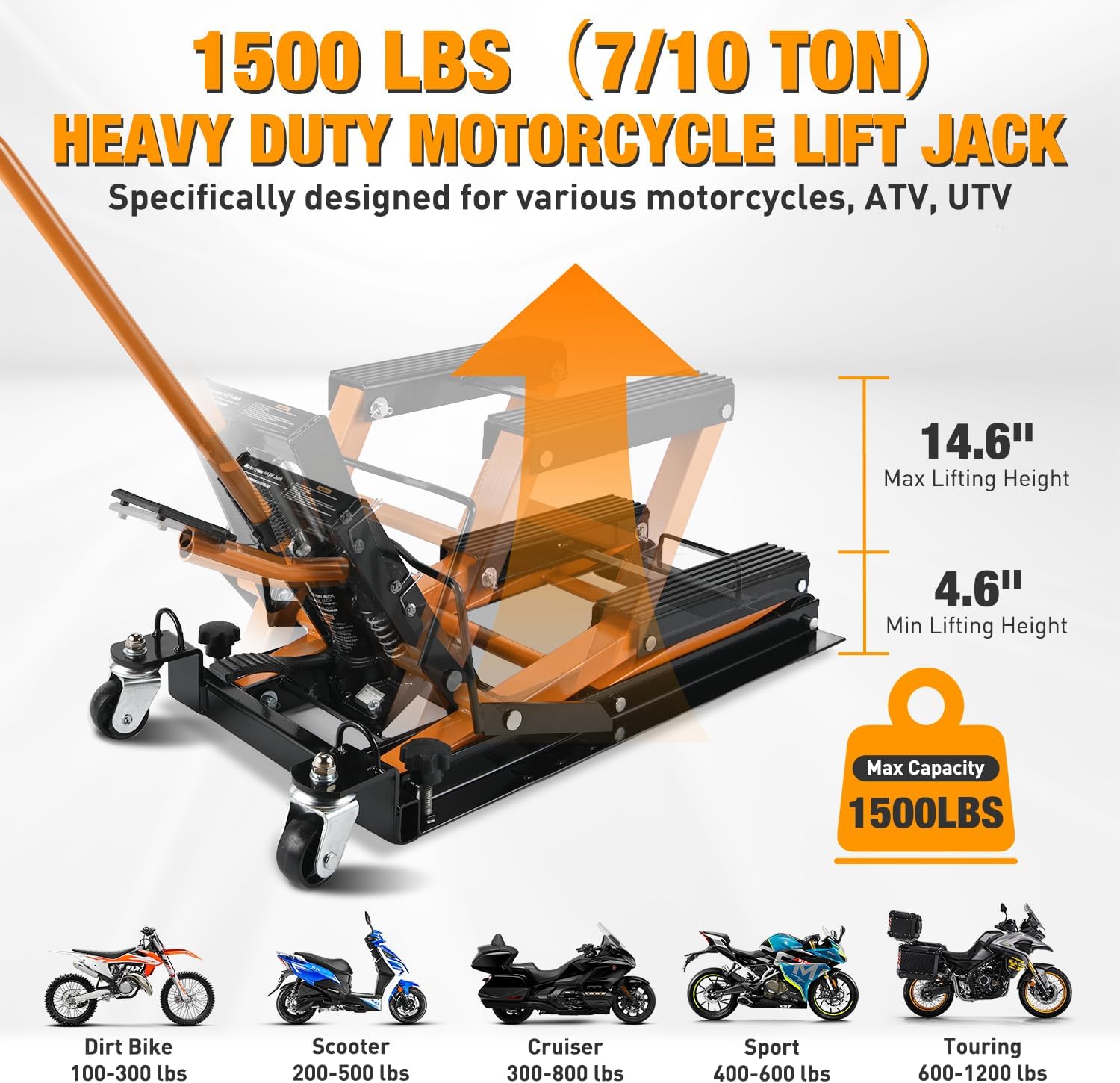 - EASY TO OPERATE: Hydraulic lift jack come with a long handle and press pedal, no other tools are needed, just step on the foot pedal release to easily lift and lower to help you lift your motorcycle or dirt bike. Less effort than a manual jack. And no more bending over! Lift adjustable height ranges from 4.6 inch to 14.6 inch. Raise dirt bikes or motorcycle to desired height for maintenance, repair or storage