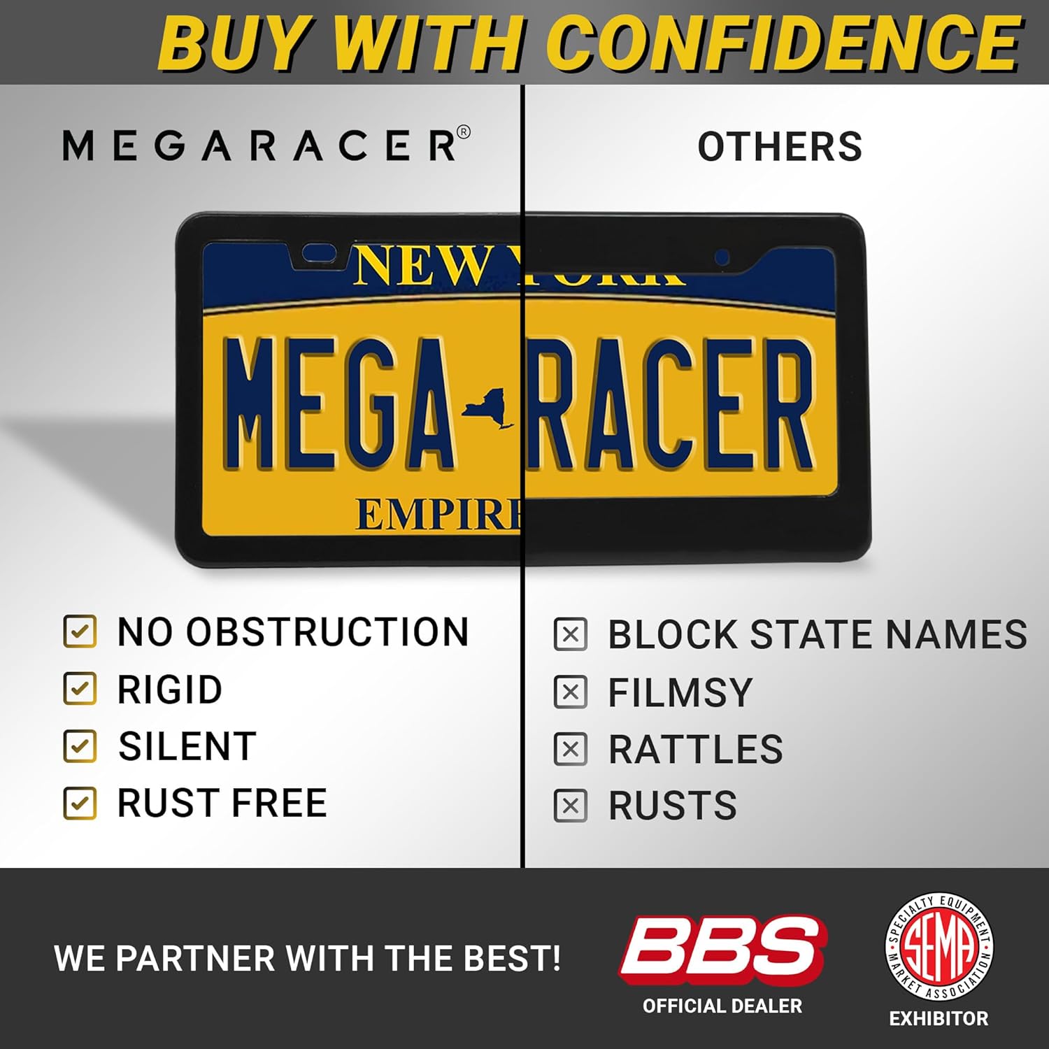 - STRONG DURABLE QUALITY: Our 4 pc License Plate Frame Black Holder is made strong to uphold anything from car washes to weather changes. Mega Racer's black license plate frames are RATTLE PROOF and RUST RESISTANT keeping your vehicle paint SCRATCH FREE.