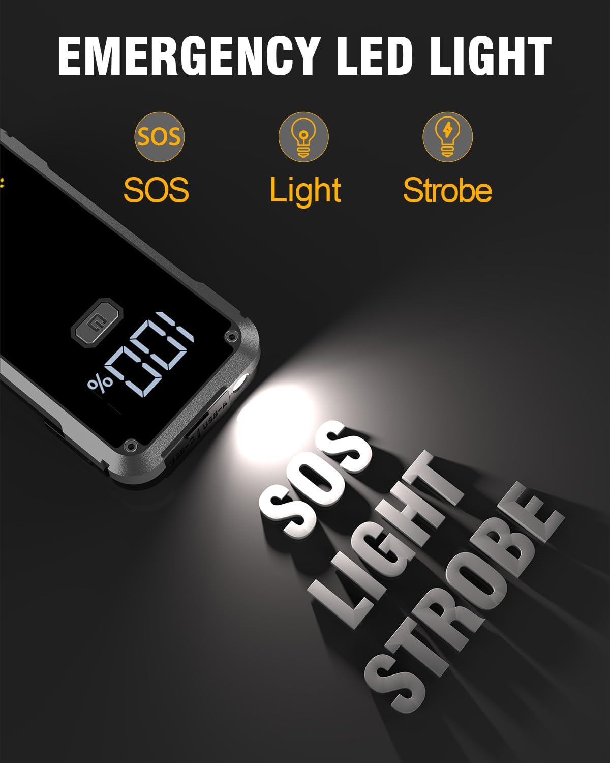 - MULTIPLE PROTECTION & SUPER BRIGHT LED - with 10 built-in safety protection technologies, you can safely start your vehicle easily and quickly in extreme environments (-4ยฐF to 140ยฐF) , Car emergency kit with 3 modes of LED light ( Lighting, Flashing, and SOS), it's perfect for daily use, commuting, outdoor activities, and perfect tool for emergencies