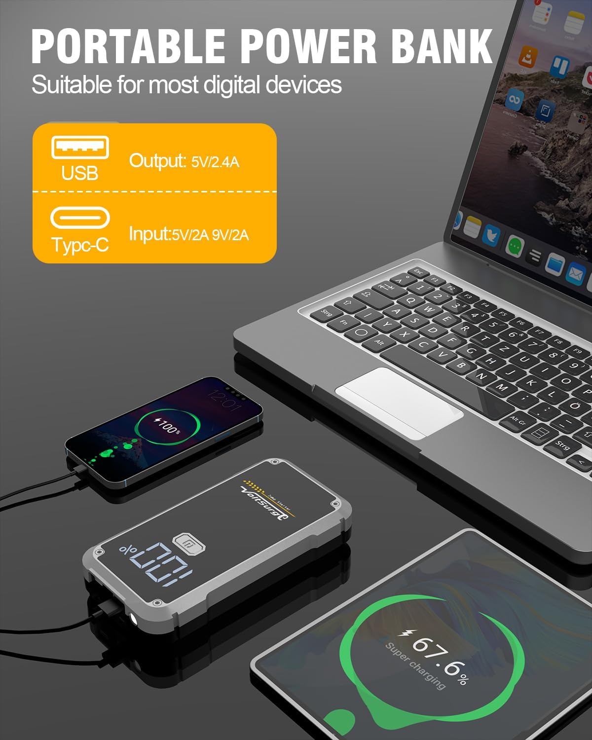 - PORTABLE EMERGENCY CAR BATTERY PACK - Jump pack is not only a car starter device but also a high capacity mobile power bank, compatible with IOS and Android, with 1 USB output port and 1 Type-C input, it can quickly charge your cell phone tablet and other mobile devices
