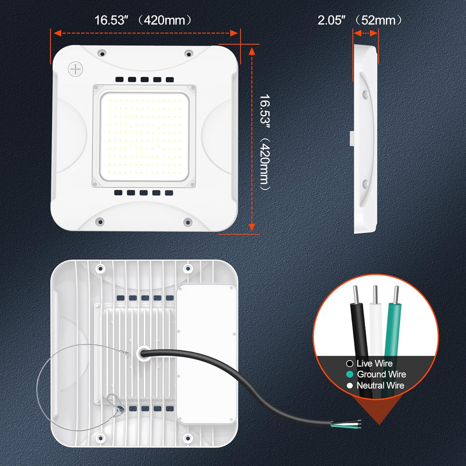 - 【IP65 Waterproof 】 IP65 waterproof and can work at temperatures ranging from -40°C to 40°C (-40°F to 104°F). This outdoor canopy lights ensures durability and longevity with a lifespan of over 50,000 hours. The light can operate under a current of AC100-277V