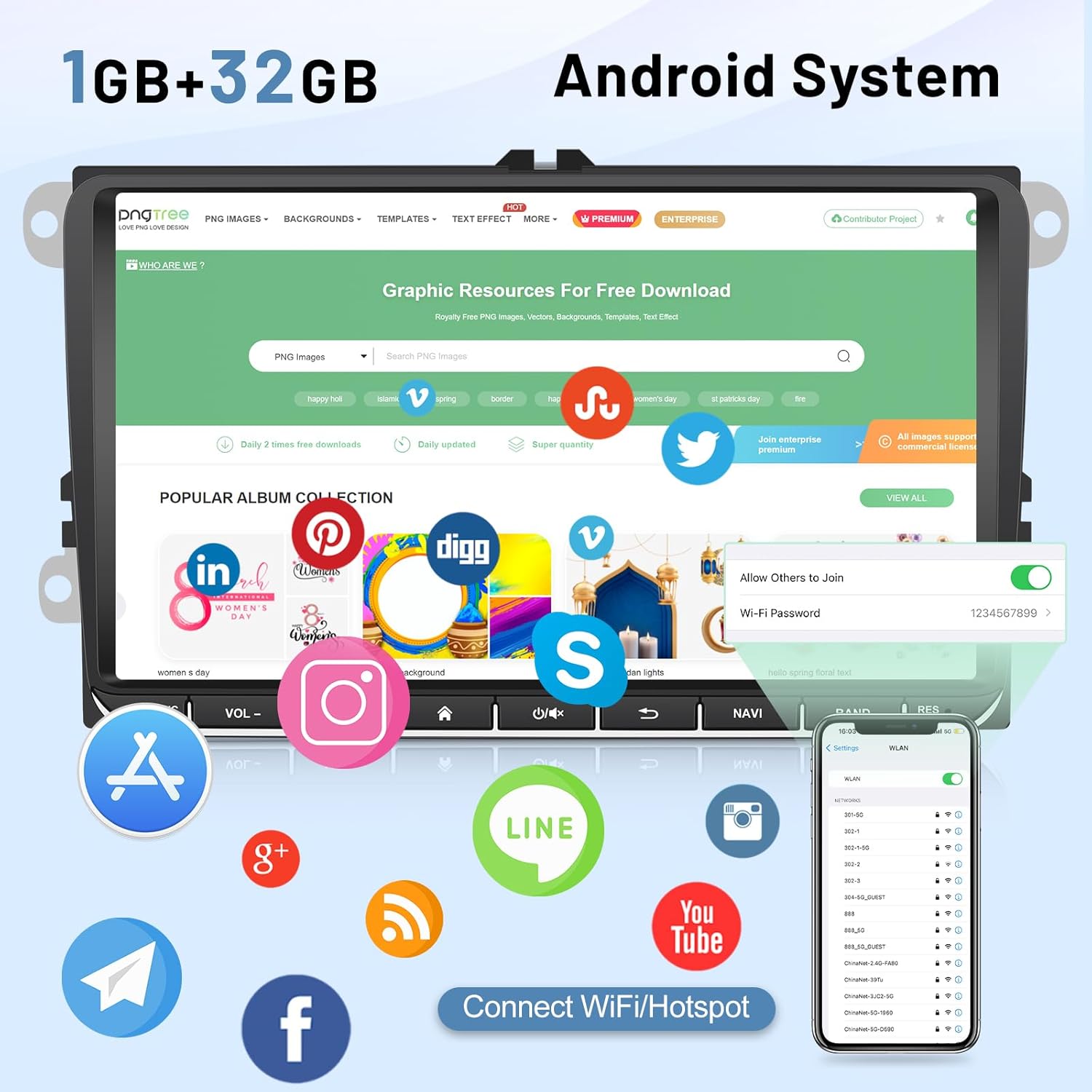 Car Radio for VW Passat Jetta Golf Skoda Polo, [1G+32GB] 9 inch Touch Screen Android Volkswagen Stereo with Wireless CarPlay Android Auto Bluetooth GPS WiFi FM+Backup Camera