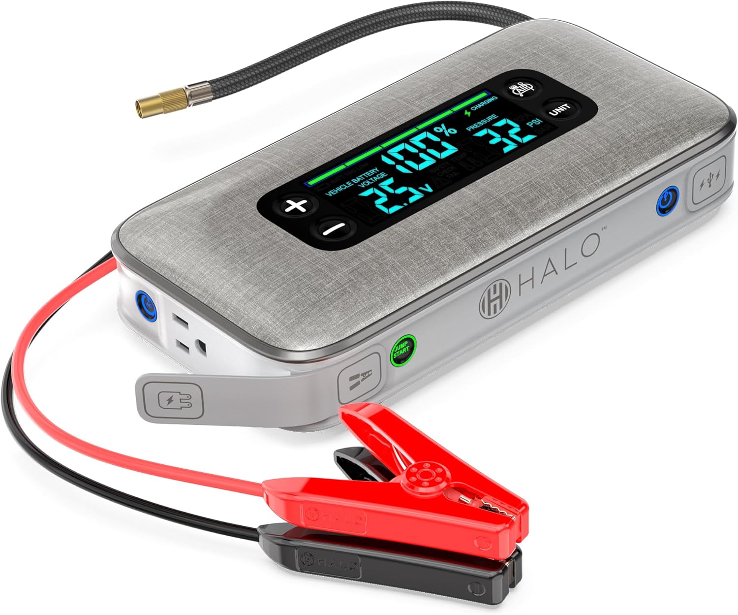 HALO Bolt Ultimate 3 Portable Car Battery Jump Starter | 130 PSI Air Compressor, 55.5Wh USB Power Bank, Large Display, Emergency Floodlight & Charger, Jumps Cars SUVs & Trucks, Inflates Tires — Silver