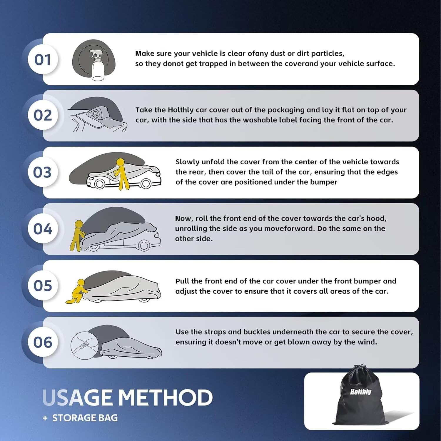• 【Product Details】 -1.The Holthly car cover features three pairs of reinforced windproof straps to keep it securely in place, even in high winds.2.A spacious storage bag is included for easy folding and transport in your trunk.3.Double stitching along the edges ensures greater durability.4.Four reflective strips are added to enhance visibility and help prevent accidental collisions at night.