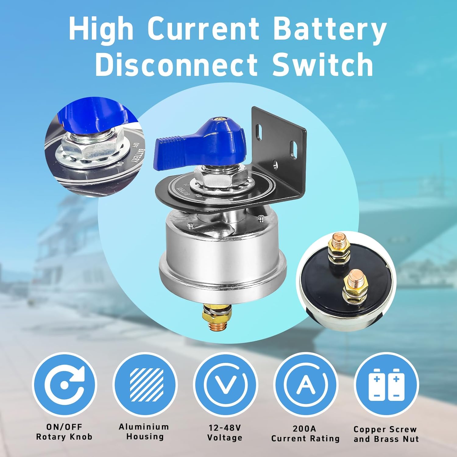 High Current Battery Disconnect Switch 200A,12-48V Battery Power Cut Off Isolator Switch with Face Plate for Car Yacht ATV RV Truck(Blue)