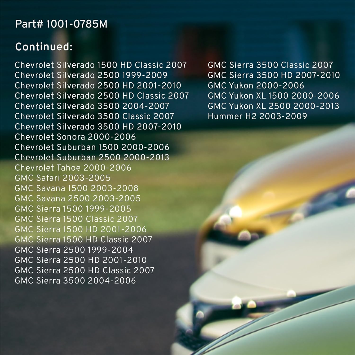 - FITMENT LIST: Select Models 1999-2013 CADILLAC/ CHEVROLET/ GMC/ HUMMER (1001-0785M) Verify Fitment using AmazonConfirmedFit tool.