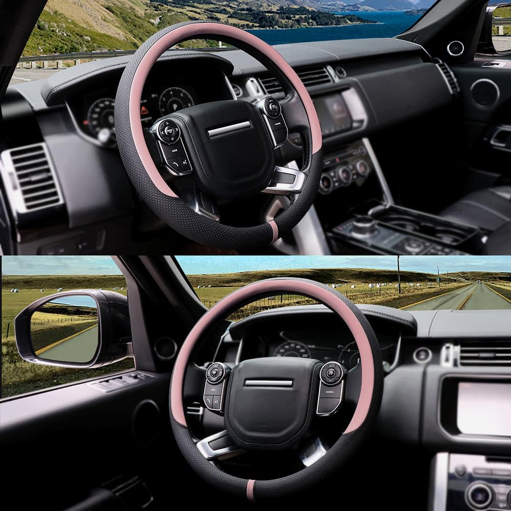 COFIT Breathable Car Steering Wheel Cover 16 inch Auto Universal Leather Wrap Non-Slip Steeringwheel Protector Automotive Interior Accessories, Pink (Suit for 15.5-16 inch)