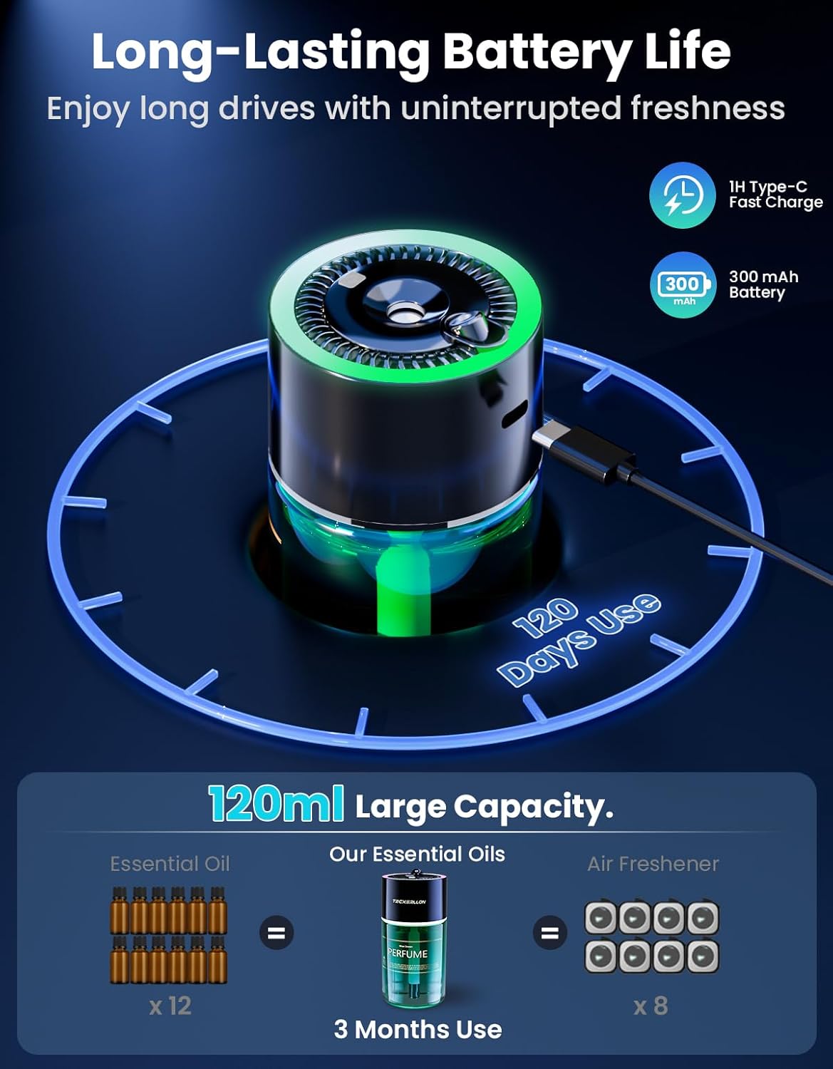 - 【120 Days of Fragrance|No More Constant Refills】Our car freshener features an oversized 120ml essential oil tank—3x larger than standard car air fresheners. One refill lasts up to 120 days, making it perfect for long road trips and everyday commuting.