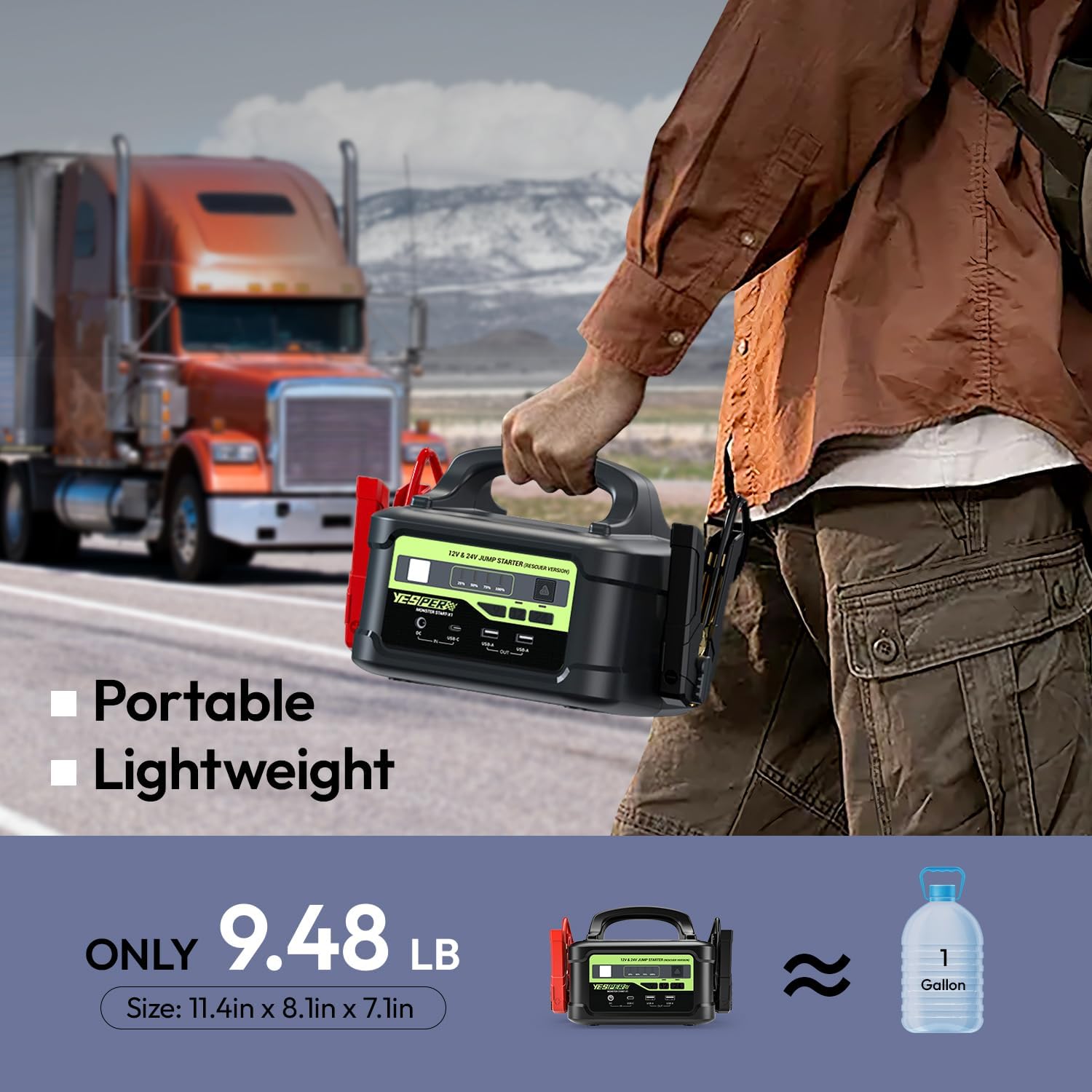 - 【Powerful Jump Starter】- YESPER MONSTER START-X1 is the latest upgraded heavy-duty 12V/24V car battery jump box for cars with 6000 amp peak starting current (suitable for all gasoline and diesel engines); it can automatically identify 12V and 24V cars and switch the starting voltage, suitable for all cars, trucks, motorcycles, boats, RVs, tractors, ATVs, UTVs, lawn mowers, snowmobiles, etc