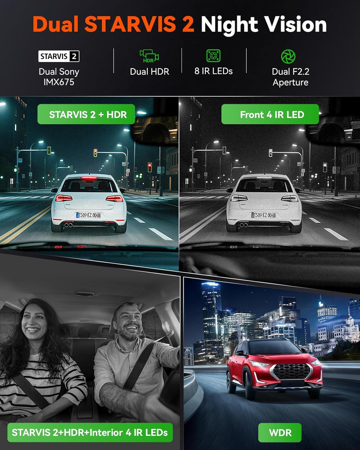 - [ Dual STARVIS 2 & HDR, 8 IR Night Vision ] Featuring cutting-edge STARVIS 2 and HDR/WDR technology, this premium 3 way dash cam combines advanced image stabilization, intelligent noise reduction, and perfect exposure balance to record high-speed objects and critical details in any lighting. With 8 powerful IR lights, it maintains crystal-clear recording of both front and cabin views in total darkness, providing you with extra peace of mind.
