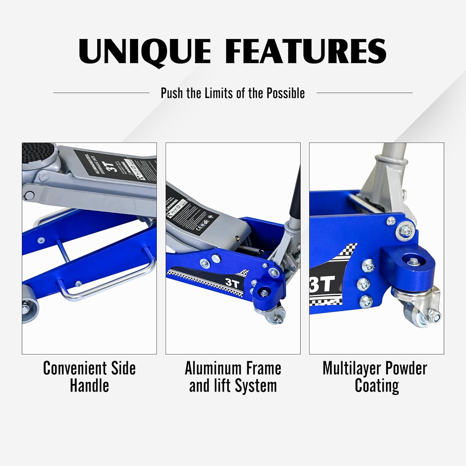 - ăStrong Carrying Capacityă:3 ton/6600lbs capacity, can help you lift the car height, not only can professionals use, daily travel weekend trip encountered problems, but also can be used for maintenance.It adopts dual pump system to provide you with efficient work.