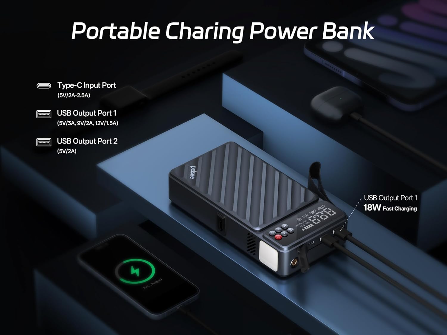 - 12 Safety Protections & 18W Fast Charge- Equipped with two output ports(USB Output Port 1-18W), Portable car battery jump starter can charge various electronic devices efficiently. 12 safety protection(Spark protection,reverse polarity etc)and multiple safety warnings provide greater security for your journey (Note: When the internal temperature reaches 95โ during inflation, it will enter overheat protection and shut down. Please wait for it to cool down before continuing to use it)