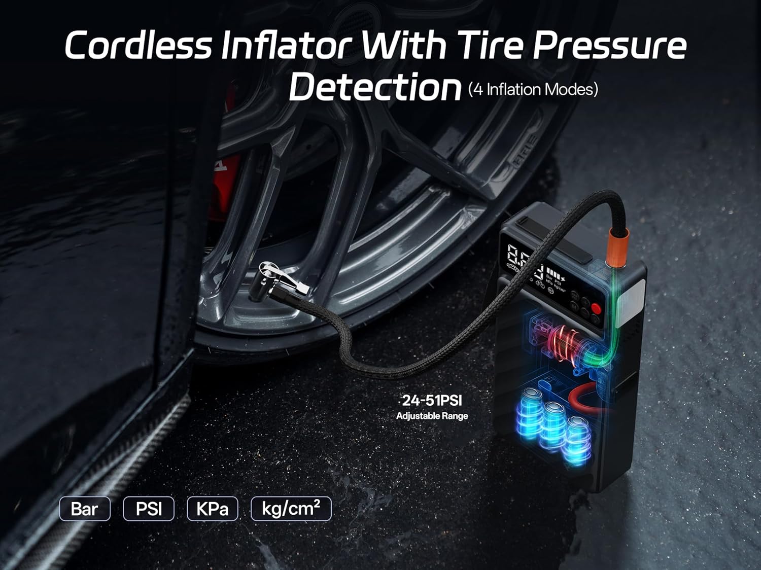 - Jump Starter with Air Compressor- Equipped with a 160PSI high-efficiency turbocharger system. Supports intelligent detection of tire pressure and automatic shutdown after 30 seconds of static rest. Equipped with 4 inflation modes(Bar,PSI,KPa,kg/cmยฒ), making quick work of insufficient tire pressure