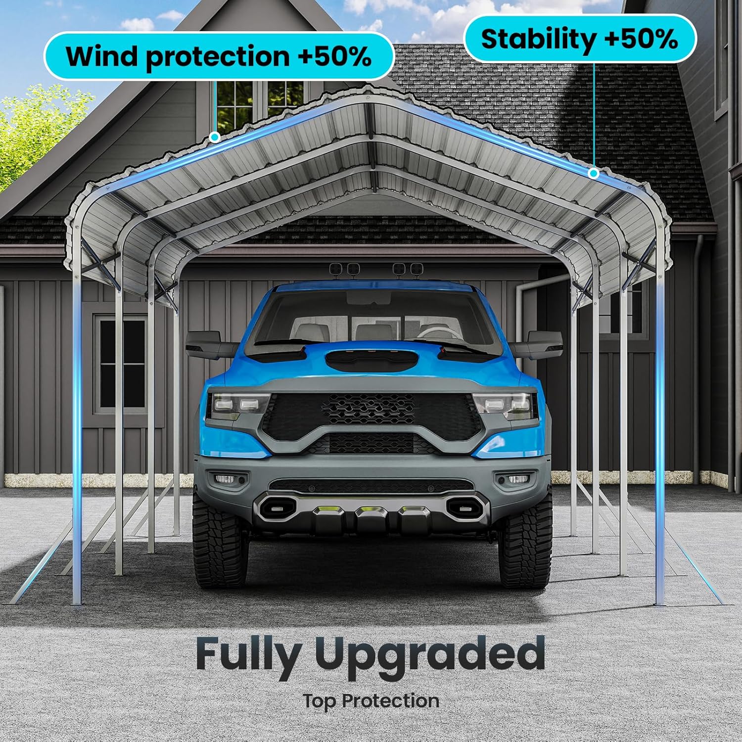 - Durable Steel Construction: This heavy-duty carport is made from premium high-strength steel with a rust-resistant coating to extend its lifespan. It not only withstands harsh outdoor conditions but also provides top-level safety against collapse