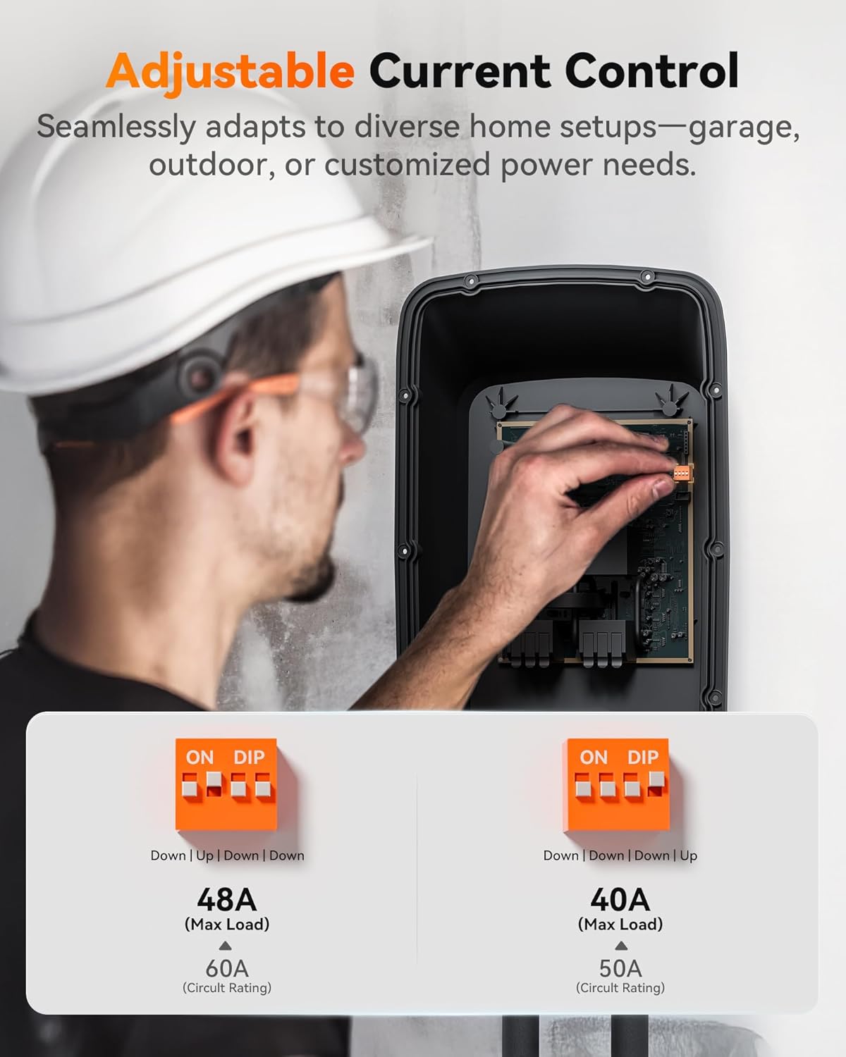 - Universal Compatibility:The wall-mounted EV charger is compatible with all J1772 electric vehicle models,including Tesla, Chevrolet Bolt, Jeep Wrangler 4xe, Ford Mach E Charger,Kia Nino, EV6, EV9, Mercedes EQS, BMW i3, Hyundai IONIQ 5 and many more.Tesla EVs, require a NACS adapter. For optimal performance and safety, the Level 2 EV Charger 40 Amp should be installed on a circuit breaker rated at 50A or greater.