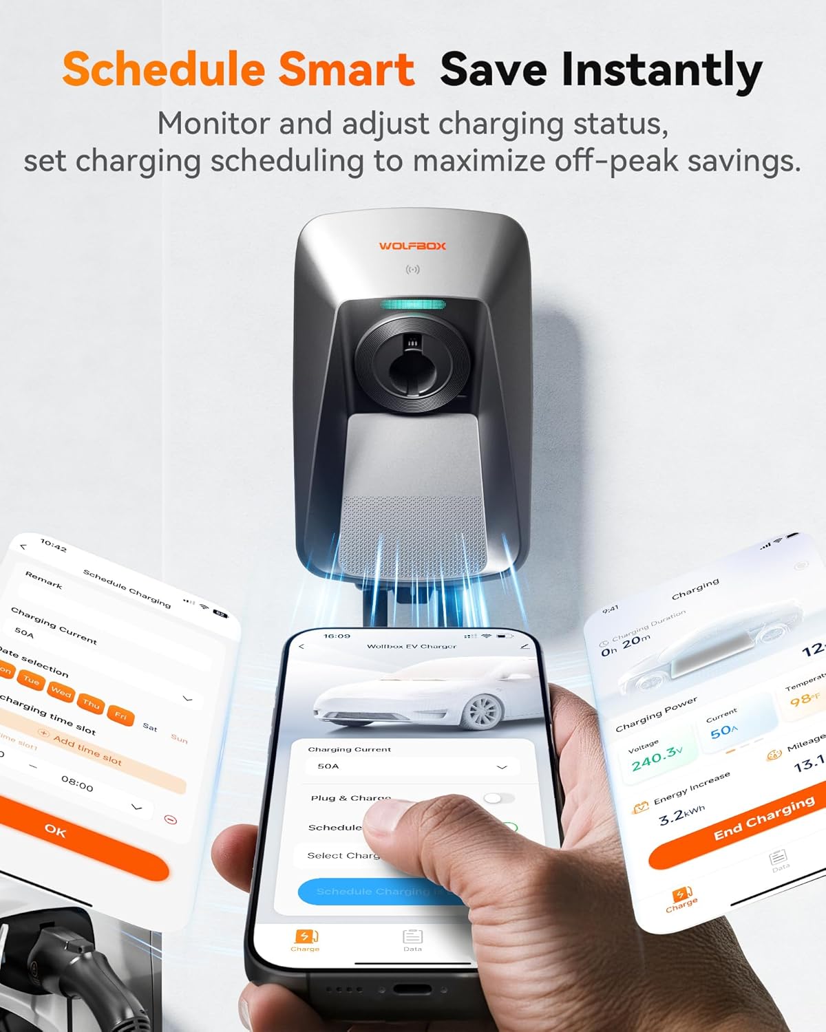 - Efficient charging: WOLFBOX ev chargers for home level 2 offers 9X faster than level 1 EV chargers, delivers 48 miles of range in just 1 hour; Choose between RFID tap-to-start, plug-and-go simplicity or app-controlled charging – making it easy for all family members to power up.