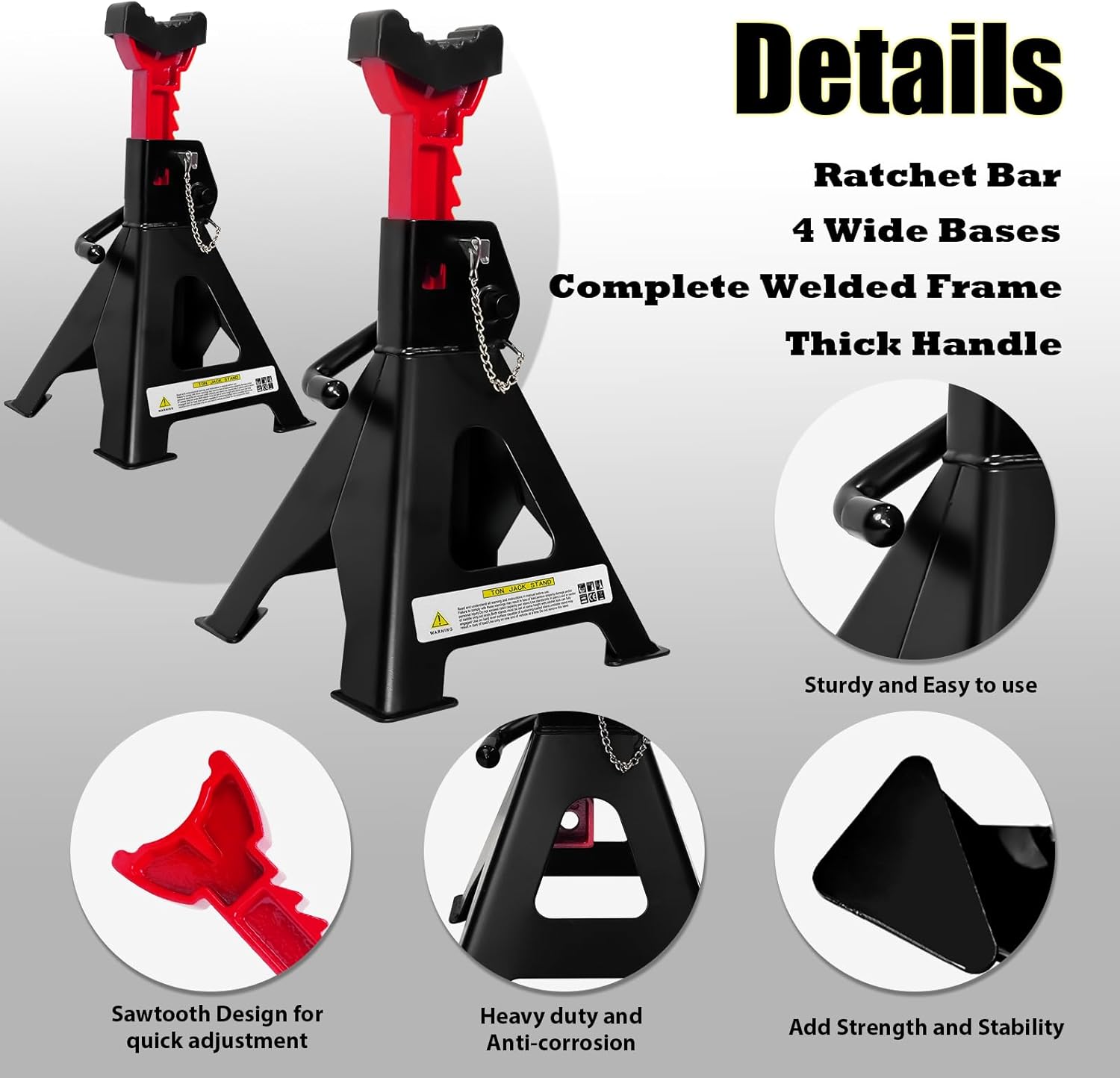 - 【Adjustable Ratchet Bar】: The multi-position ratchet bar is made of high-quality cast ductile iron, thickened and forged in one piece, which is durable and not easy to break. The ratchet bar adopts a serrated design, which can be easily and quickly adjusted to the required height and locked in place, allowing DYI enthusiasts or mechanics to maintain or repair cars safely and happily
