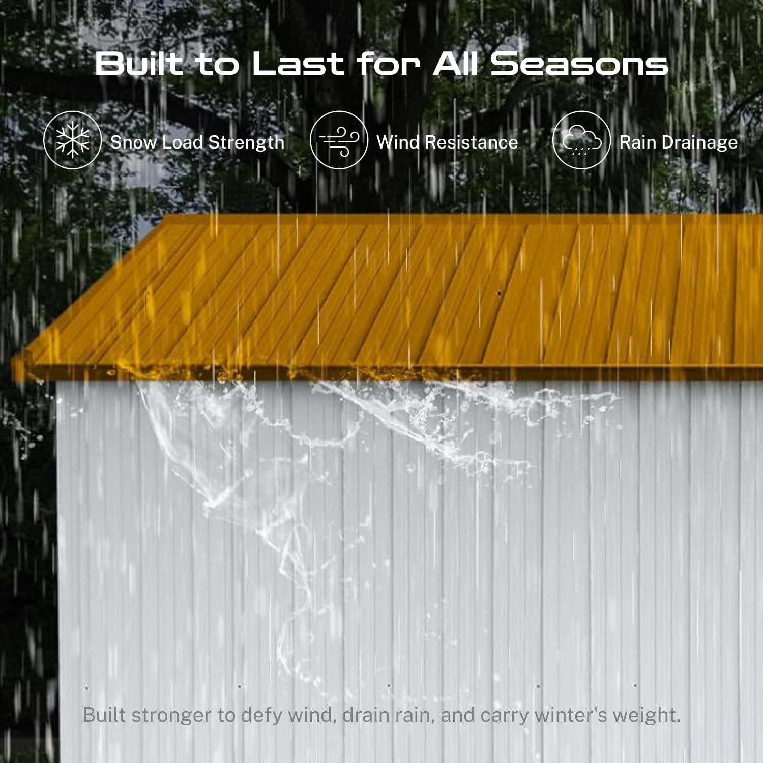 - β [Sloped Roof for Superior Weather Protection] Designed for real-world conditions, the efficient sloped roof system guarantees optimal rainwater drainage, preventing damaging pooling and leaks. This key feature in our storage buildings and sheds clearance design minimizes maintenance and ensures your tools, equipment, and belongings stay consistently dry inside