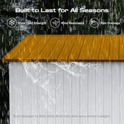 - β [Sloped Roof for Superior Weather Protection] Designed for real-world conditions, the efficient sloped roof system guarantees optimal rainwater drainage, preventing damaging pooling and leaks. This key feature in our storage buildings and sheds clearance design minimizes maintenance and ensures your tools, equipment, and belongings stay consistently dry inside