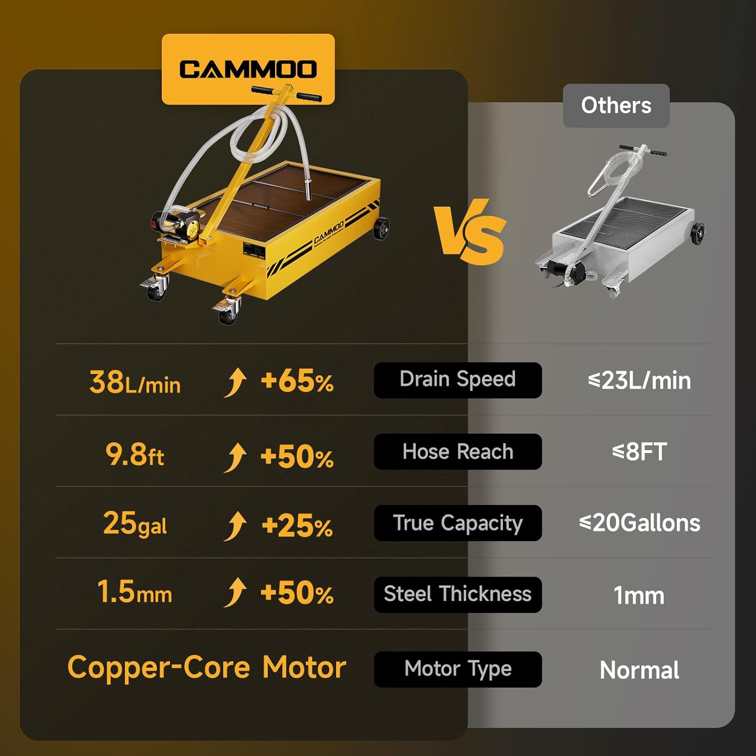 - High Capacity:Oversized 39.76" x 23.23" x 8.5" steel tank delivers a verified 25 gallons and provides a bigger footprint than standard oil drain pans so shop owners, fleet managers, farmers and DIYers can drain a full-size pickup, two RVs or four sedans in one go with less lifting, fewer trips to the recycler and more time for paid jobs. It works with all common waste oils (motor, hydraulic, etc.)—gasoline explicitly excluded.
