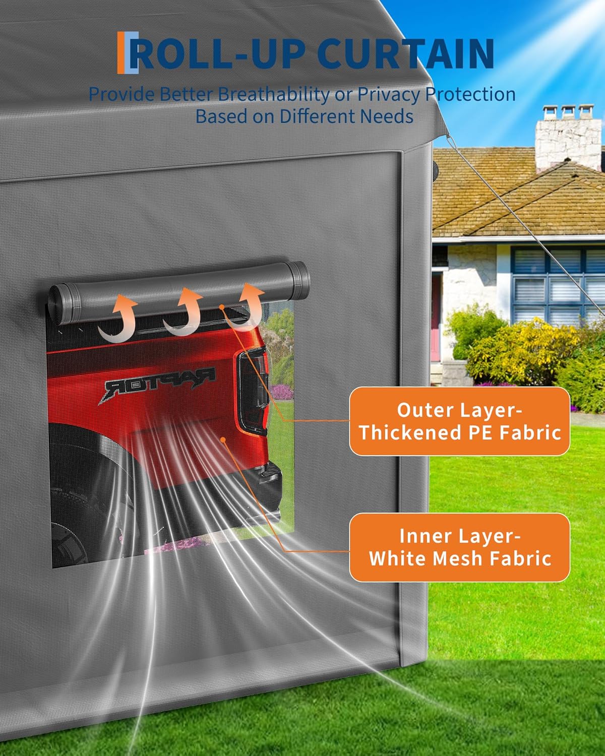 - Ventilated Design with Roll-Up Doors & Windows: Roll-up windows and doors improve airflow for heat control and easy access to parked vehicles. Flexible use: open for ventilation in summer or closed for full protection in rain/snow.