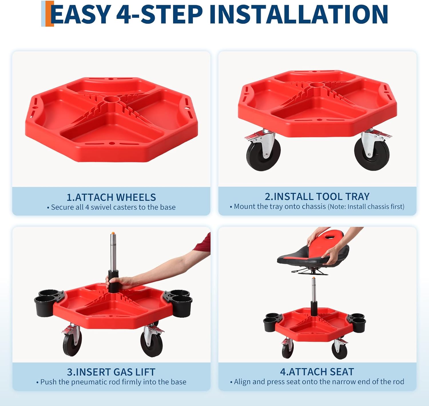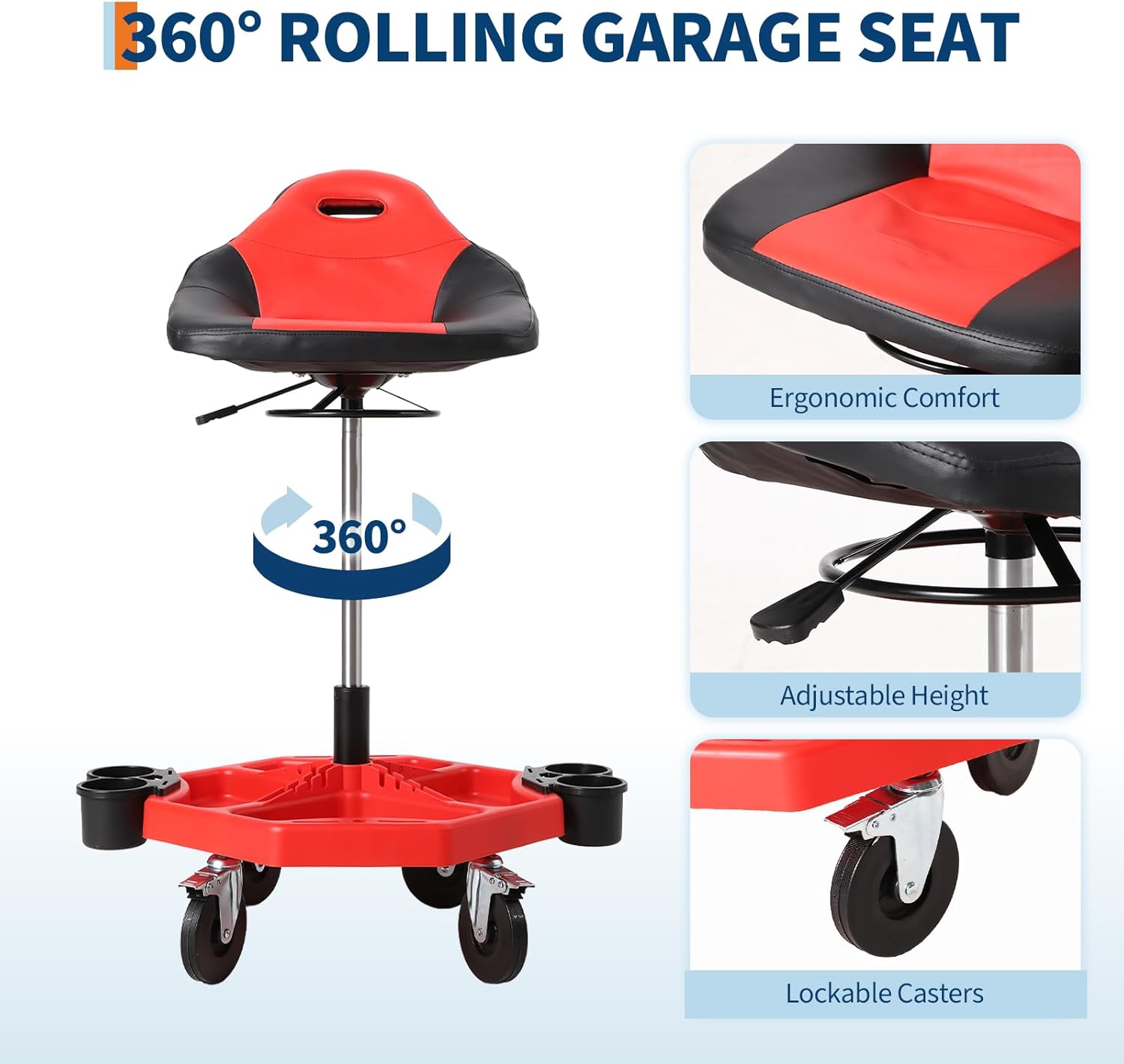 - Convenient Tool Storage: Keep your tools close at hand with a spacious built-in magnetic tool tray under the seat, making it ideal for mechanics, detailers, and anyone needing quick access to tools.
