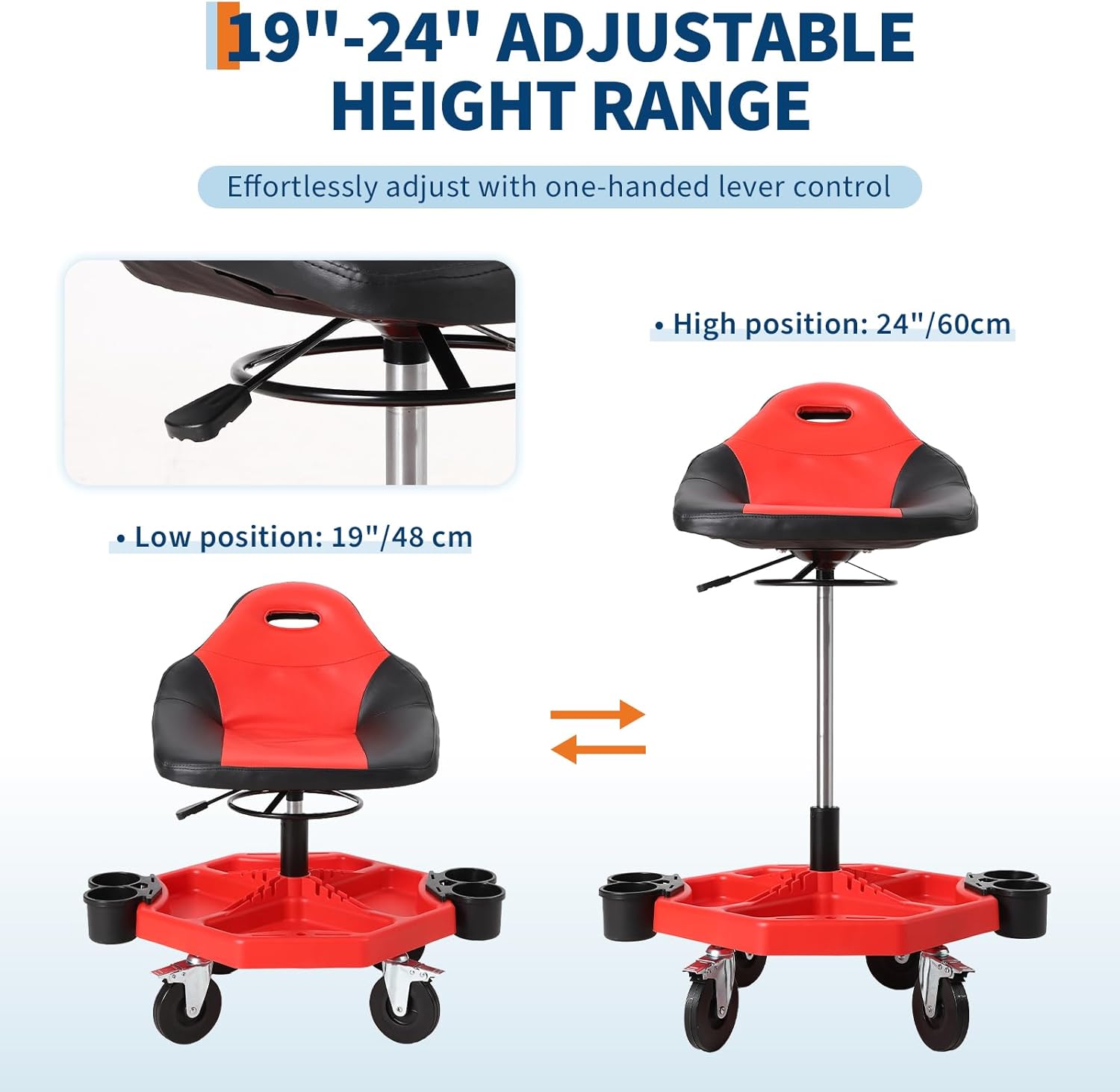 - Adjustable Height Comfort: Easily adjust this rolling mechanic stool from 19 to 24 inches to fit your workspace, while the ergonomic seat ensures lasting comfort during long hours of use.
