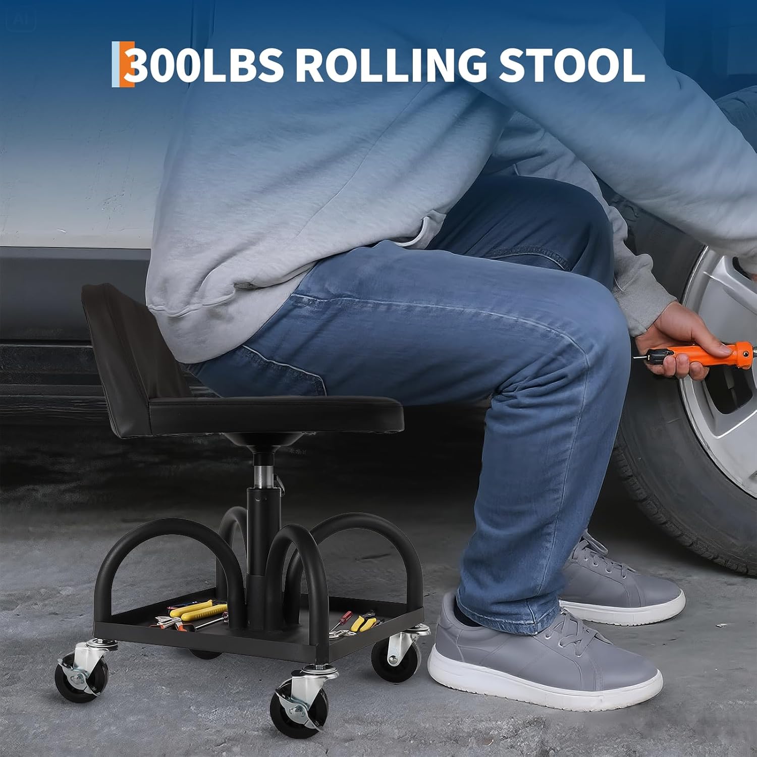 - Durable Heavy-Duty Construction: Crafted from sturdy steel with an anti-rust, anti-corrosion coating, this mechanic stool supports up to 300 lbs, built to withstand demanding workshop and garage environments.