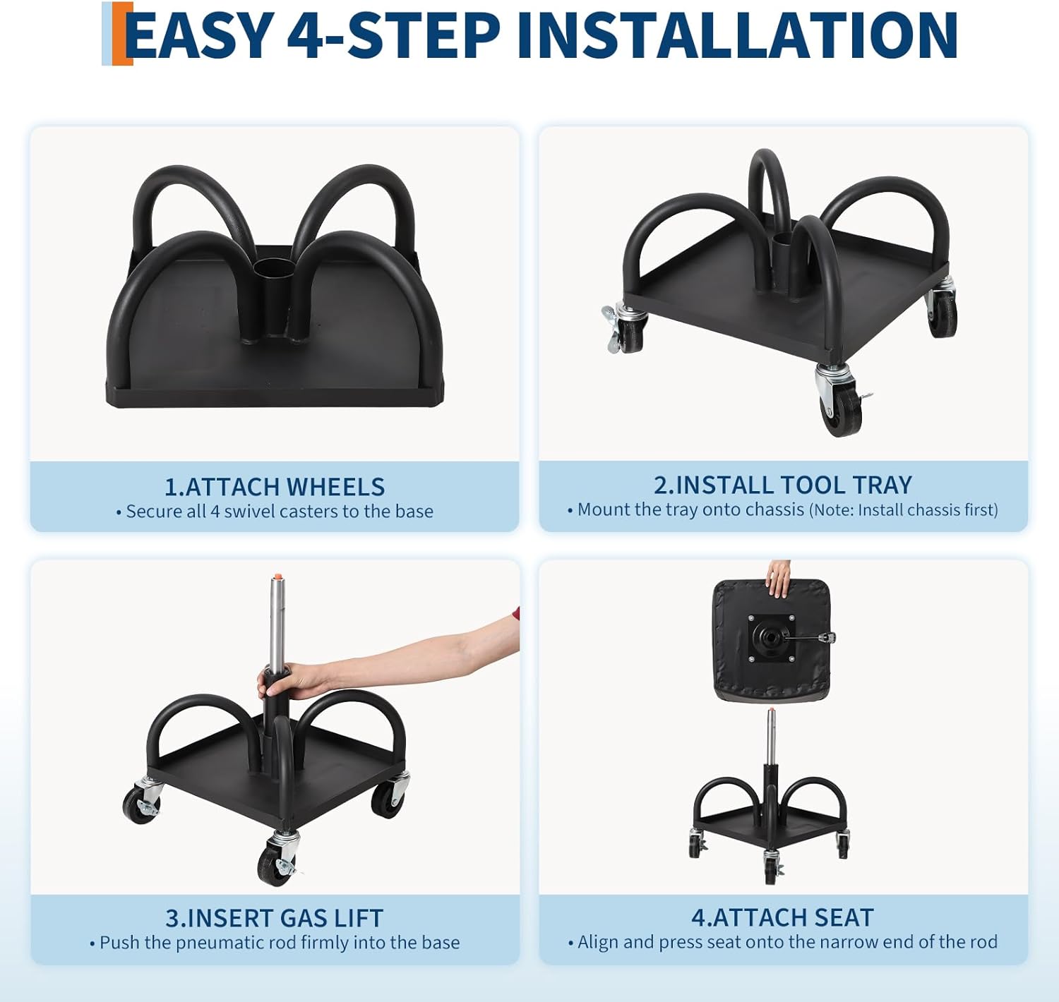 - Convenient Tool Storage: Keep your tools close at hand with a spacious built-in magnetic tool tray under the seat, making it ideal for mechanics, detailers, and anyone needing quick access to tools.