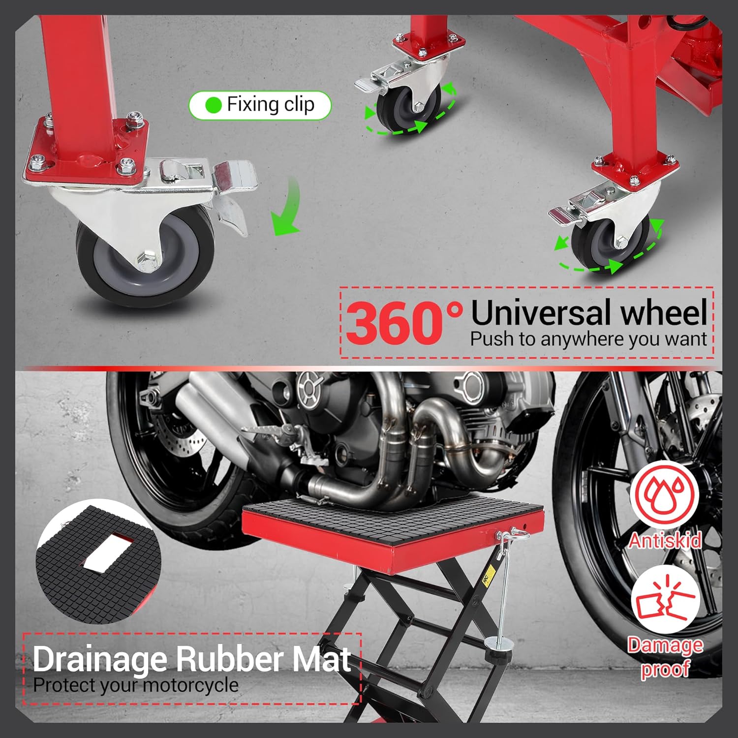 - Exceptional Safety with Heavy-Duty Construction โ 350 lbs Capacity & Solid Steel Frame: High-strength worm gear transmission and scissor structure ensure secure lifting for motorcycles, ATVs, and dirt bikes. โ Safety Pin & J-Hook: Prevents shaking or overturning during maintenance. Locking pole and bolt add double protection against accidental drops. โ Anti-Slip Rubber Pad: Striped veins on the top surface protect your vehicle from scratches and slippage.